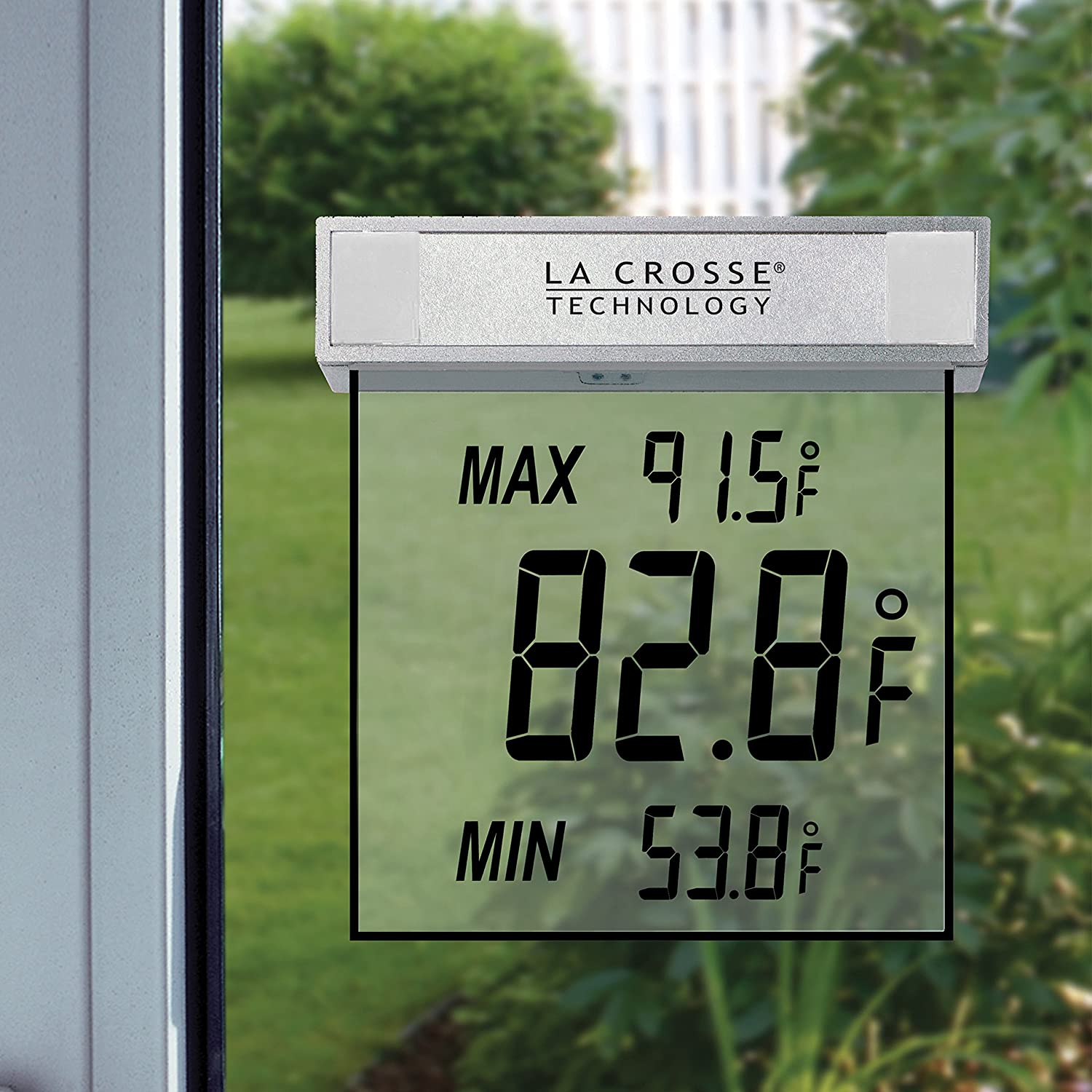 Nhiệt kế cửa sổ ngoài trời kỹ thuật số từ La Crosse; gắn phẳng với cửa sổ bằng dải keo để đọc nhiệt độ ngoài trời.